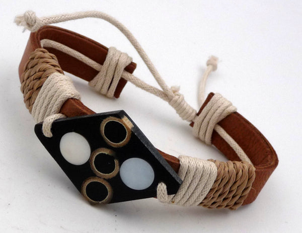 Bracelet unisexe en cuir, nacre, rotin et bambou.
