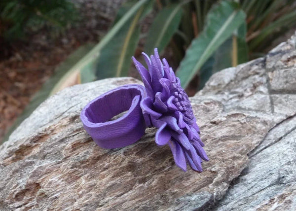 Bague en cuir marguerite fleur violette taille réglable